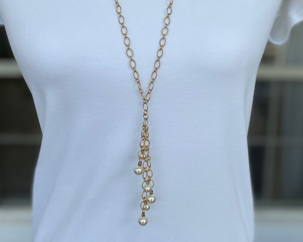 Long Gold Triple Pearl Drop Necklace - This 36" Chic Necklace with lobster clasp is handmade with high quality materials and will look great with any ensemble. Matte gold plated for a warm golden finish that has a subtle glow.